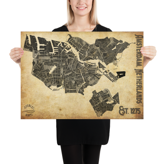 Póster de mapa antiguo de Ámsterdam, Países Bajos: impresión de mapa de ciudad vintage y arte mural de viaje