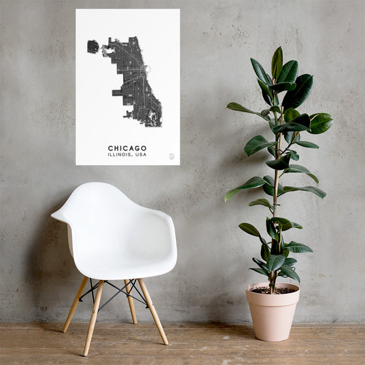 Mapa minimalista de Chicago, Illinois, EE. UU.: decoración de pared elegante para viajeros | Preciso y hecho a mano | Blanco y negro | Póster de decoración del hogar, regalo perfecto